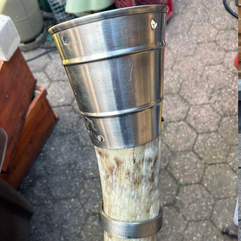 Auch an das Basiselement, das Horn selbst, kommt er ran. Aus Bayern bezieht er seine Rinderhörner, die vorher lange ausgekocht werden, damit das Knochenmark entfernt wird. Als ersten Schritt muss Florian dann die angebrachten Metallringe gut kontrollieren. Denn das größte Ärgernis für einen Hönes ist ein undichtes Horn, insbesondere wenn Rost mit dem Wasser auf Uniform fließt und garstige Flecken bildet. Vorne sollte das Horn nicht zu weit vom Körper abstehen, zwar noch genug Platz für Orden und Abzeichen lassen, aber auch einen leichten Blick zur linken Seite für den Hönes ermöglichen. Auf den vollen Straßen mit gelegentlicher Überquerung ist dies bei den Festumzügen nicht unwesentlich, weiß der erfahrene Hönes, insbesondere beim Rückmarsch durch das Gedränge auf der Rollmopsallee.