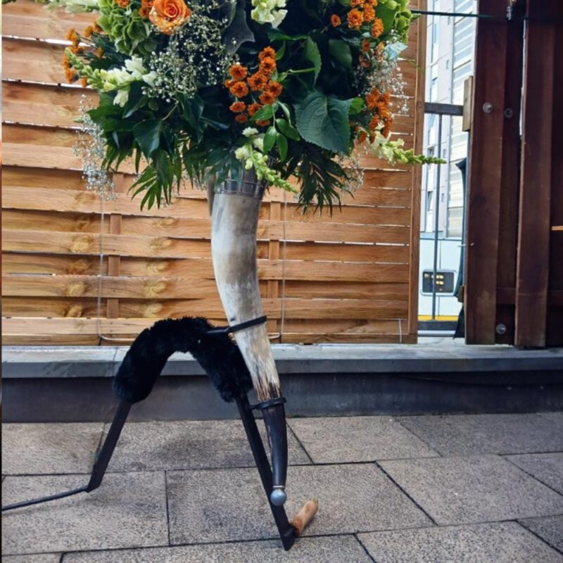Florian Quirinus Deuss ist nicht nur seit fünf Jahren mit Leidenschaft Hönes im Jägerzug Steinadler, sondern hat sich vorgenommen auch anderweitig zur Blumenpracht in den Neusser Straßen, die Ende August wieder erblüht, beizutragen. Der gelernte Elektriker, dem die Kunst des Schweißens nicht fremd ist, weiß um den raren Bestand und die wenigen Beschaffungsquellen für manches Schützeninventar und hat sich somit kürzlich der Herstellung von Blumenhorn-Gestellen gewidmet.