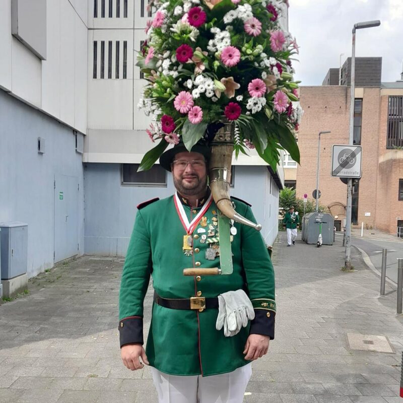 Während ihn seine primäre selbständige Tätigkeit als Veranstaltungs- und Lichttechniker für Bühnenshows und Musicals in den kalten Monaten durch ganz Deutschland treibt, ist er somit im Sommer seiner Heimatstadt umso näher und nicht nur mit Jäger- und Hubertuszügen vernetzt. Auch Vereine von außerhalb des Neusser Regiments und sogar einige Floristen haben schon Hörner und Gestelle bei ihm angefragt.