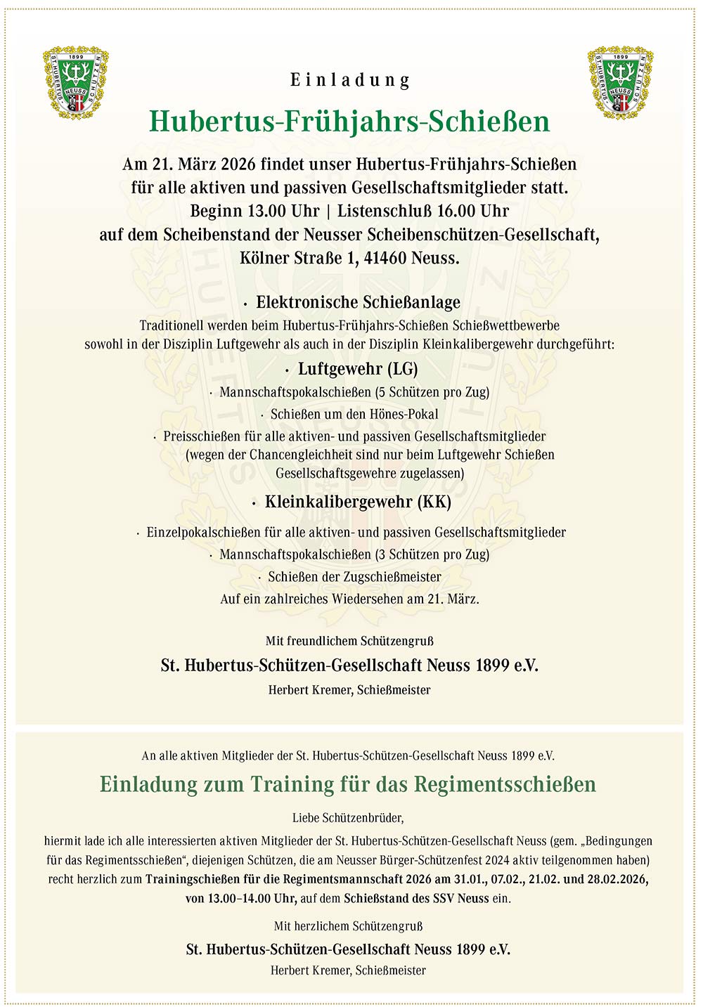 Am 21. März 2026 findet unser Hubertus-Frühjahrs-Schießen für alle aktiven und passiven Gesellschaftsmitglieder statt.