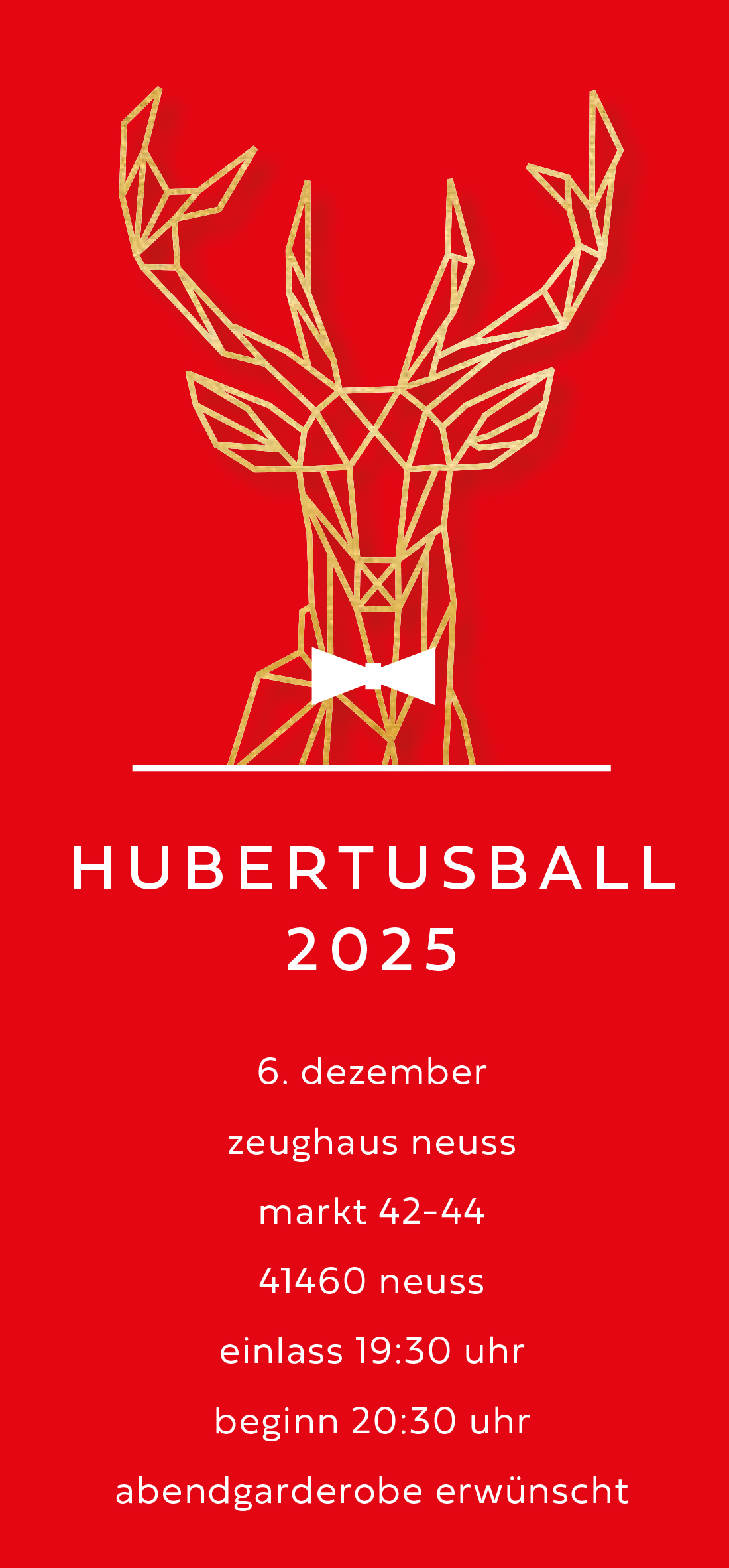 Der Hubertusball findet am 06.12.2025 im Zeughaus Neuss statt. Einlass 19:30 Uhr | Beginn 20:30 Uhr | Abendgarderobe erwünscht.