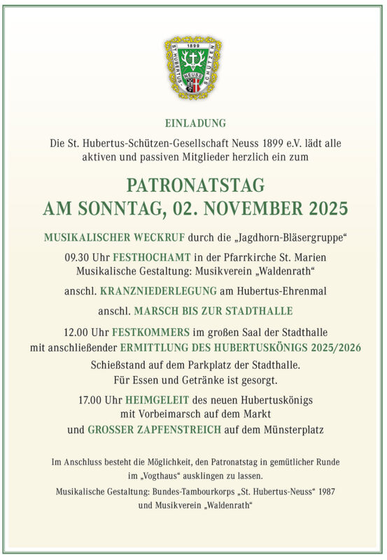 Die St. Hubertus-Schützen-Gesellschaft Neuss 1899 e.V. lädt alle aktiven und passiven Mitglieder herzlich ein zum PATRONATSTAG.